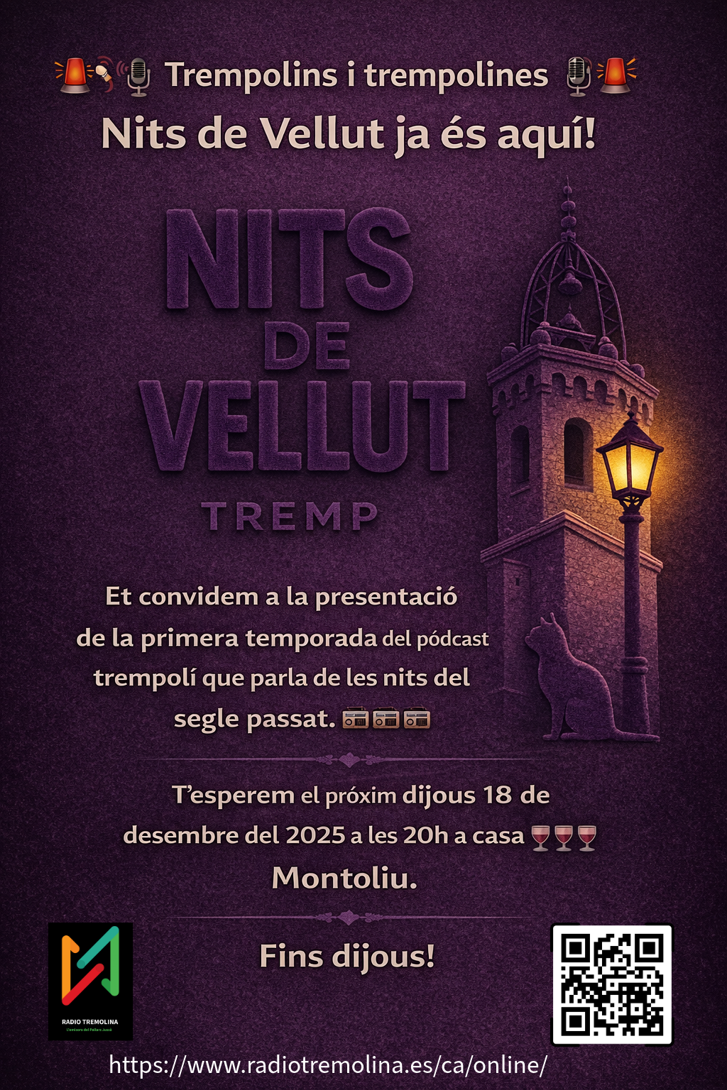 Tremp, 18 de diciembre de 2025 – Ràdio Tremolina, la emisora oficial del proyecto, tiene el placer de invitar a toda la ciudadanía a la presentación oficial de la primera temporada del podcast "Nits de Vellut" (Noches de Terciopelo). El evento tendrá lugar hoy, jueves 18 de diciembre, a las 20:00 h, en el emblemático espacio de Casa Montoliu.